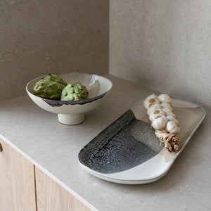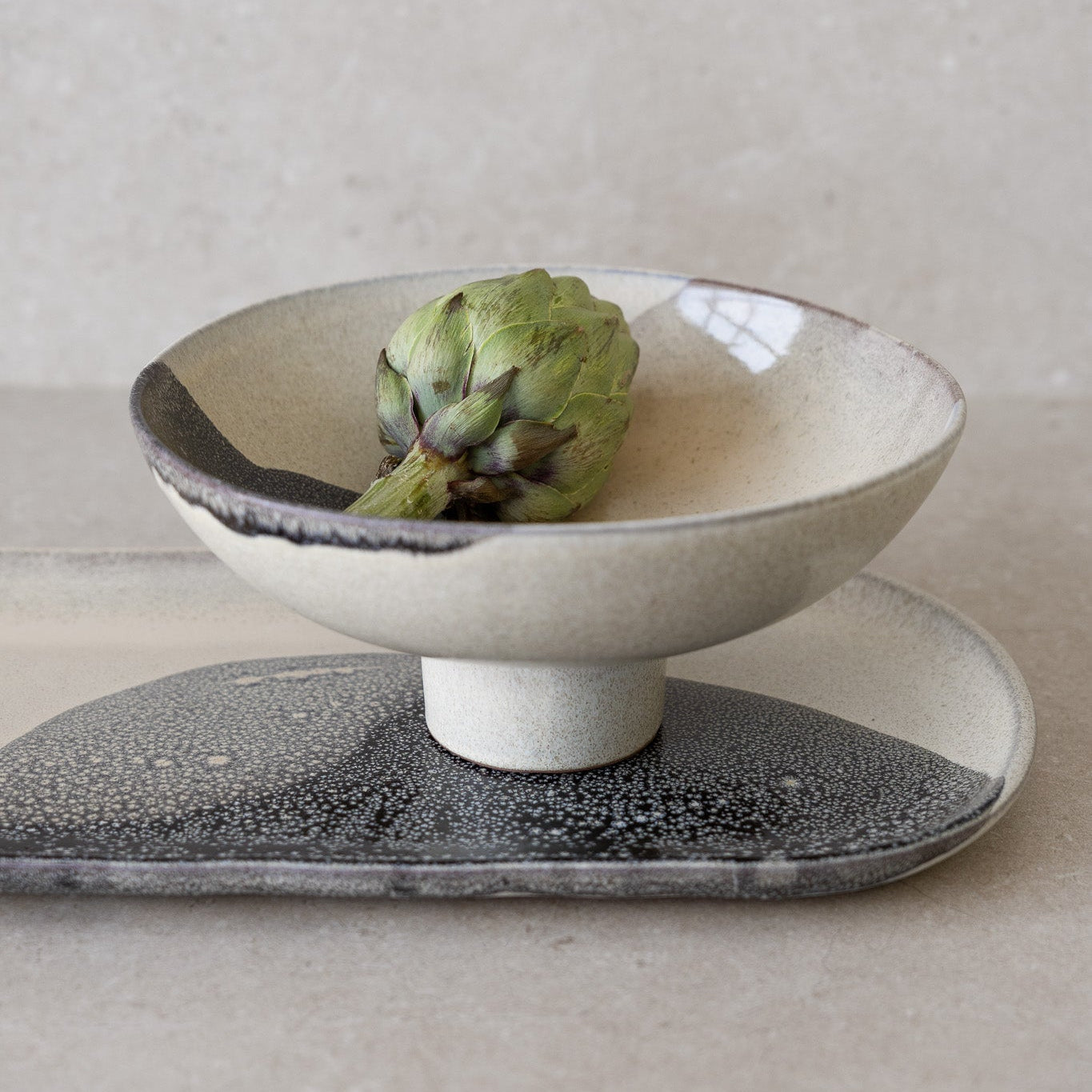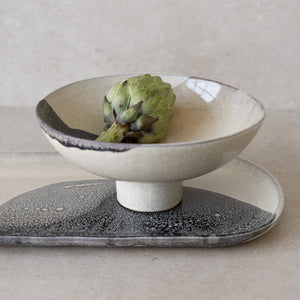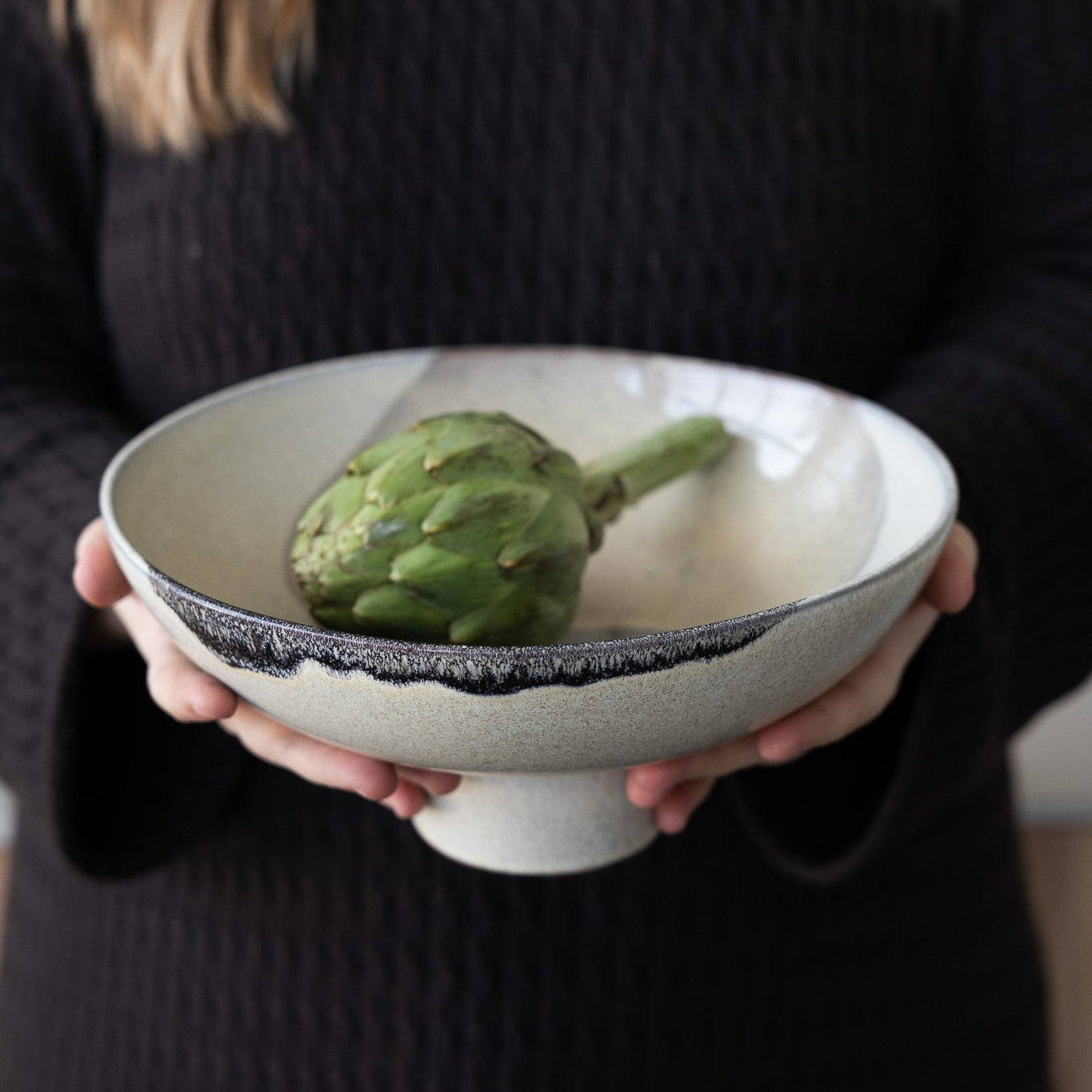 • Handgerð skál á fæti úr keramik.  Hver skál hefur sinn sjarma og engin er eins.  Fullkomin undir salat, snakkið eða bara ein og sér.