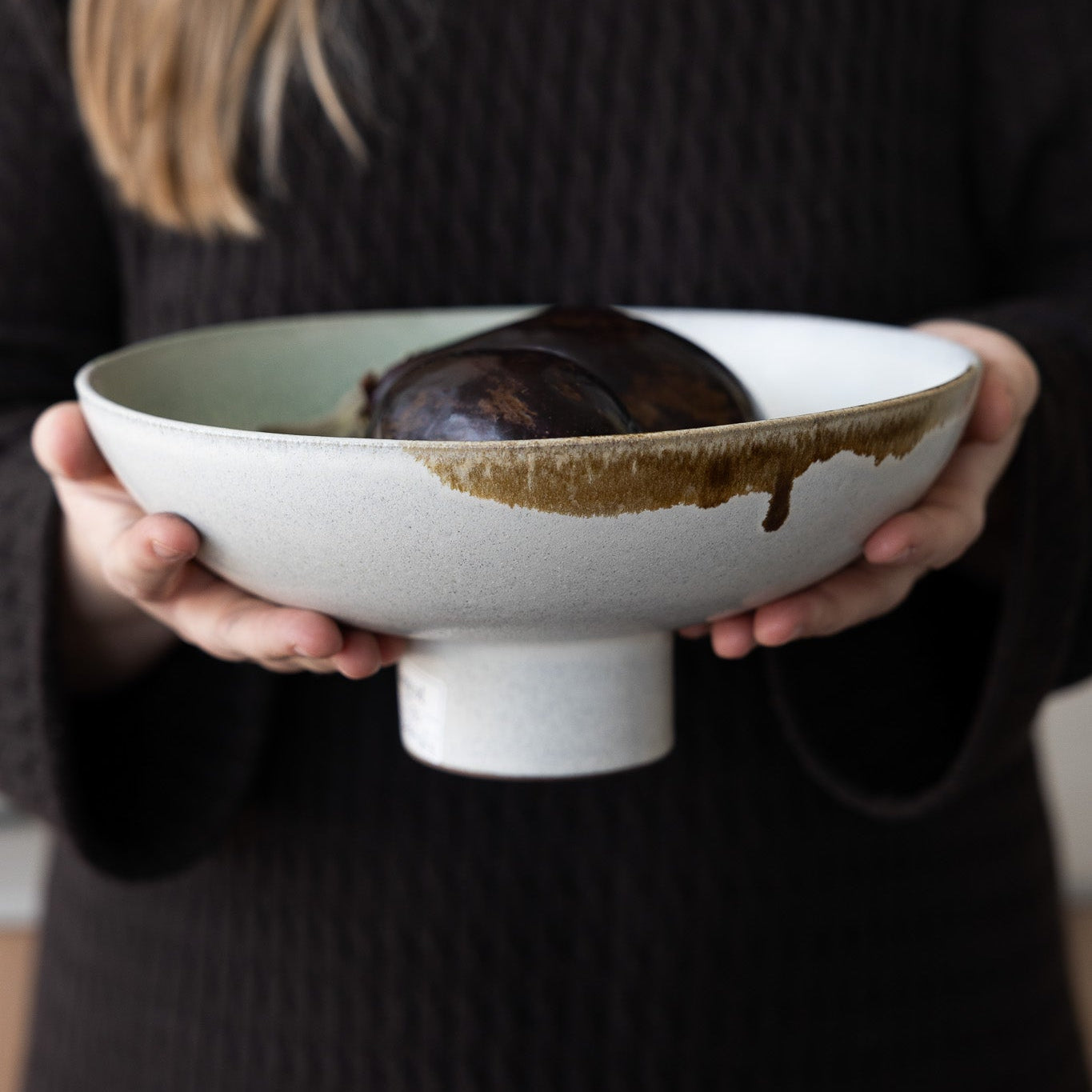 • Handgerð skál á fæti úr keramik.  Hver skál hefur sinn sjarma og engin er eins.  Fullkomin undir salat, snakkið eða bara ein og sér.